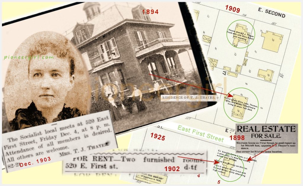 The two houses (519 and 520 East First Street) never appeared on the same Sanborn Fire Insurance Map, so my map in my picture was pieced. The 1909 drawing shows an addition to the Thayer house (added before Tom’s death), which doesn’t appear in the house photo taken in 1894. The house Eliza Jane bought was only one story, according to the fire map.