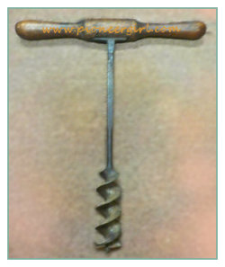 The auger most likely used was a T auger, consisting of fairly large diameter drill bit with a wooden handle attached at a right angle to the long shaft. If the handle broke or split, another one could easily be fashioned from a piece of wood. If the bit became dull, it was sharpened with a file. The bit had a small screw tip used to position the bit in the center of the spot to be drilled, then the hands grasped the handles on either side, turning a half or quarter turn before letting go and re-positioning the hands. The angled sides of the bit cut into the wood, creating a round hole. The twisted shank cleared chips out of the hole as it was drilled.