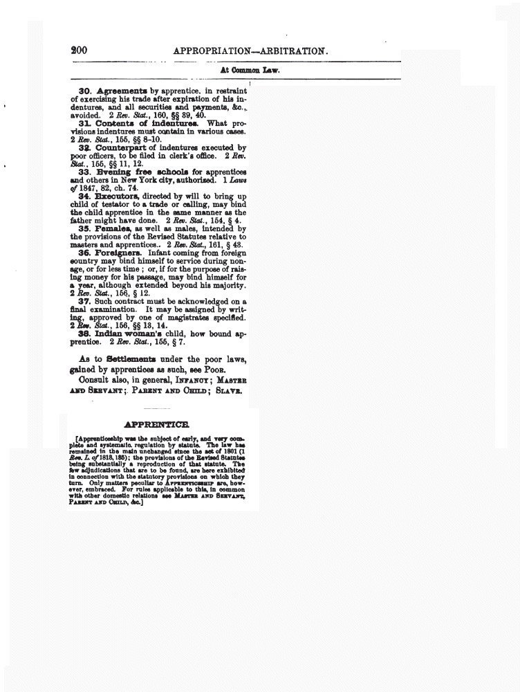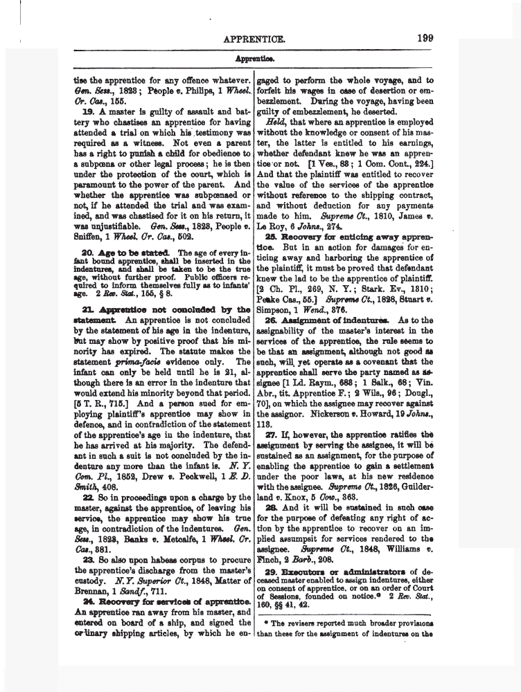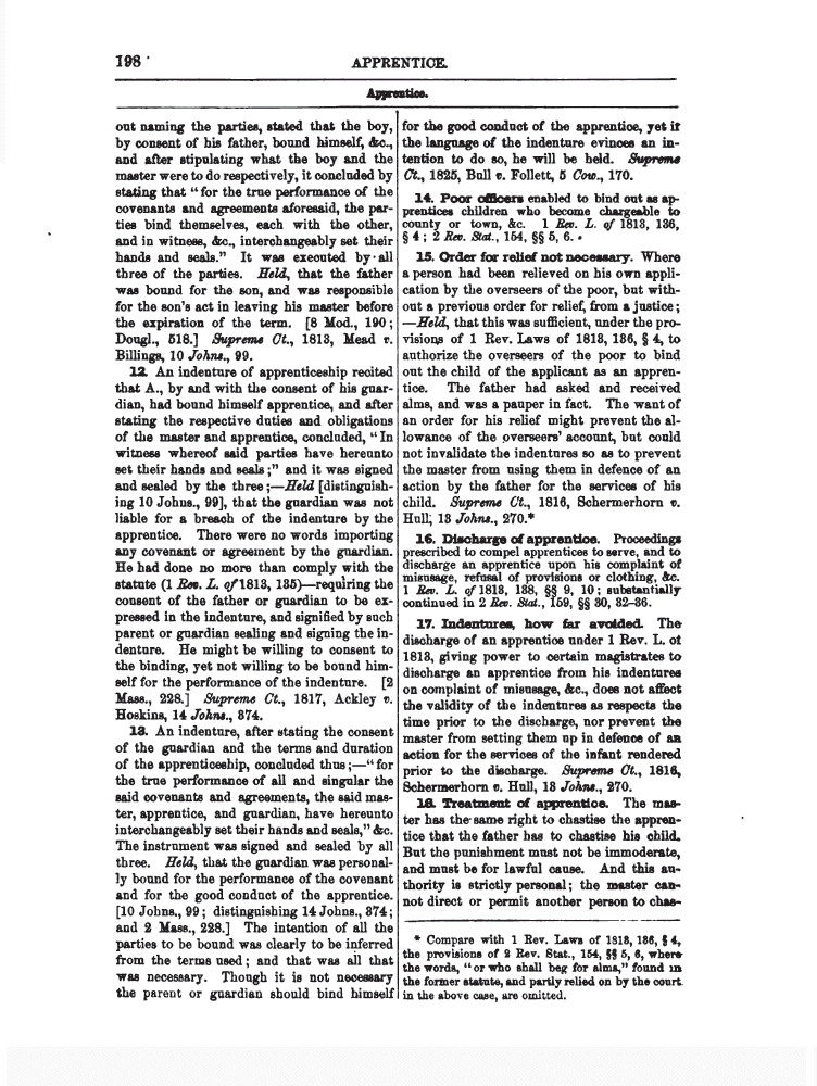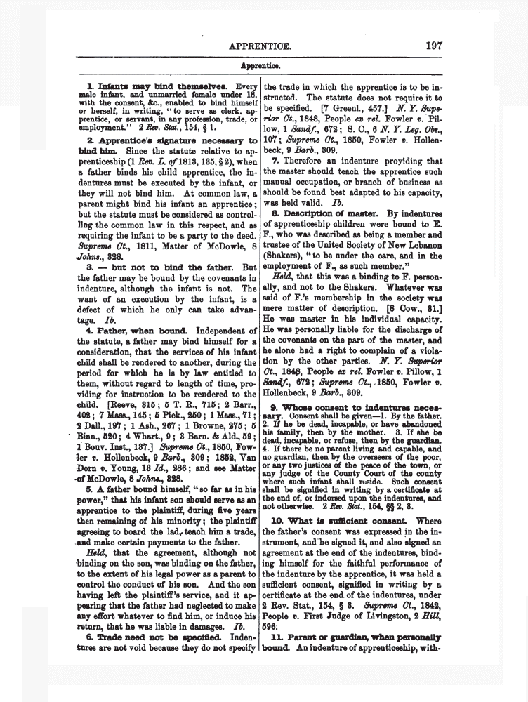 1860s New York laws governing the master / apprentice agreement. Click on the images below to read the New York statutes that would have covered Almanzo Wilder’s apprenticeship to Mr. Paddock, if such an arrangement had taken place. Pages are from A Digest of New York Statutes and Reports, Volume I (New York: John S. Voorhies, Law Bookseller and Publisher, 1864), 197-200.