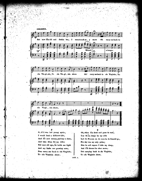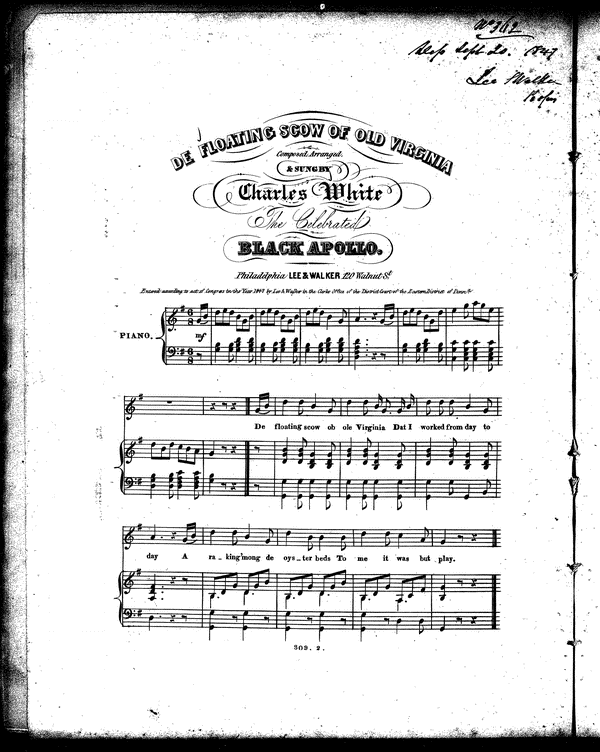 The Floating Scow of Old Virginia was written by Charles White, and published in 1847 by Lee & Walker. Charles White (billed as “the black Apollo”) was a composer, arranger, and leader of White’s Serenaders, a popular minstrel troupe which performed primarily in New York City in the 1850s. White also managed the Melodian Minstrel Theater. Dan Emmett, composer of the familiar Little House song “Old Dan Tucker,” frequently performed with Charles White.