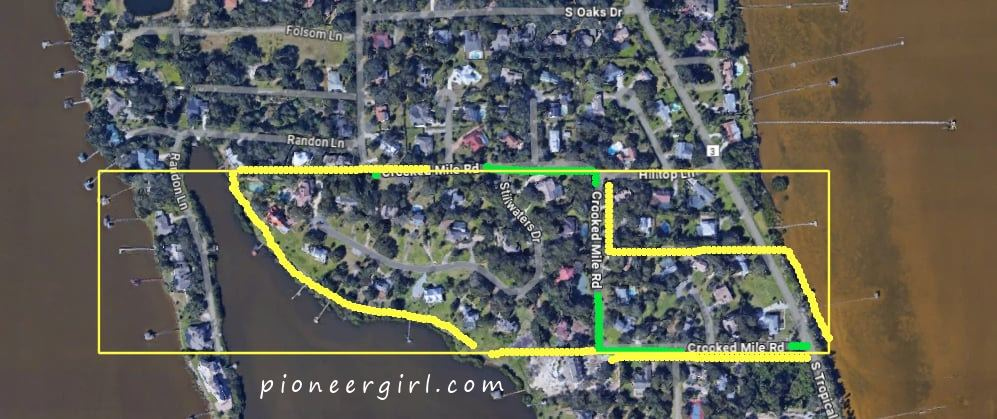 Rough sketch of Albert and Alice’s 35 acre parcel (wiggly yellow line) on which you can also see street names.