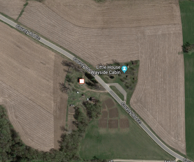 Mouse-over / hover over the image below to see a 1949 aerial photograph in place of the 2019 Google aerial view of the Pepin Wayside area (Charles Ingalls’ land) to see how it looked before the replica cabin and parking area was added. The red box is not the replica cabin; it outlines the roof of the farmhouse on the west side of County Road CC, which is in both aerials. The replica cabin is beneath the word “Cabin” on the Google image.
