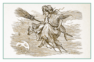 There is a common illustration for one of the Mother Goose rhymes, though, that does show an old woman with a peaked hat and a broom (no goose) above a large moon. It’s the illustration for “Old Woman, Old Woman,” but in the drawing, the old woman isn’t riding the broom. The verse goes: