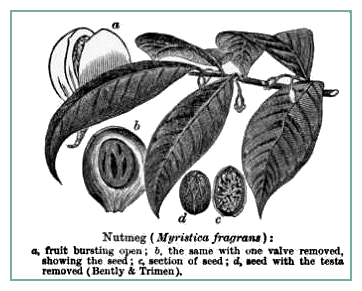 This well-known and favorite spice is the kernel – mostly consisting of the albumen – of the fruit of several species of Myristica. This genus belongs to a natural order of exogens called Myristicacæ, which contains about forty species, all tropical trees or shrubs, natives of Asia, Madagascar, and America. They generally have red juice, or a juice which becomes red on exposure to air. The leaves are alternate and without stipules. The flowers are unisexual, the perianth generally trifid, the filaments united into a column. The fruit is succulent, yet opens like a capsule by two valves. The seed is nut-like, covered with a laciniated fleshy aril, the albumen penetrated by the membranous covering. All the species are more or less aromatic in all their parts; their juice is styptic and somewhat acrid; the albumen and aril contain both a fixed as an essential oil, and those of some species are used as spices.