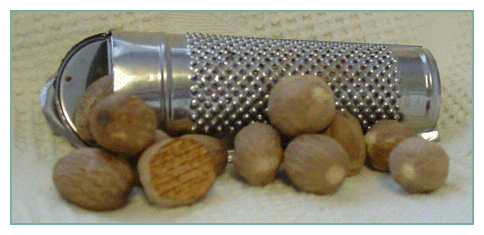 Nutmeg grater and nutmegs. Note the flattened nutmeg that has been grated. One or two nutmegs are stored beneath the hinged lid at the top of the grater; grated nutmeg falls out the bottom of the grater. This grater is the same design as one owned by Laura Ingalls Wilder and on display at the Laura Ingalls Wilder / Rose Wilder Lane Home and Museum in Mansfield, Missouri. Tour guides have said that the grater at the museum was a wedding present to Laura Ingalls Wilder, but it is not known if this is indeed fact. These graters are commonly sold today.