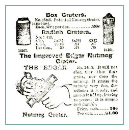 Nutmeg Grater For Sale. The advertisement shown here includes a grater similar to Laura’s. In 1894, when this advertisement was printed, such a grater sold for twenty cents. Today, one sells for about five dollars.