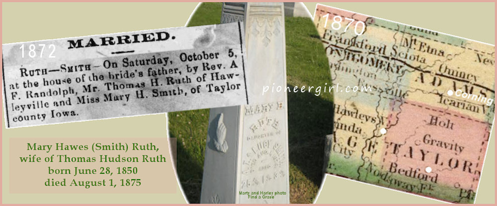 Banker Ruth’s First Wife — In 1868, Thomas Ruth moved from Greene County, Pennsylvania (where he was born and raised), “to Page County, Iowa, where he soon afterward began buying cattle for West & Company, of Hawleyville, Iowa. After a time he engaged in business for himself.” This statement is from Banker Ruth’s biography published in 1898 [see below]. What isn’t in his bio is that he had declared personal bankruptcy in Greene County shortly before the move.