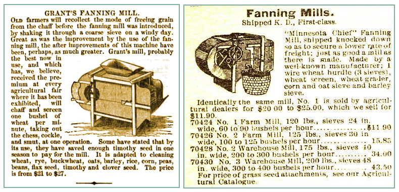 19th Century Fanning Mills. The advertisements at left below appeared in newspapers dating from the time of Farmer Boy. The advertisement at right below is from the 1894 Montgomery Ward catalog. The navigation button that brought you to this page shows a photograph of a restored 1880s mill.
