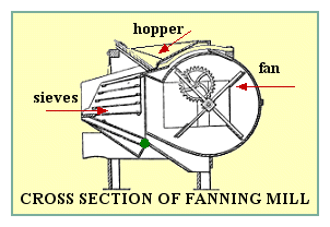 The mechanical fanning mill (fanner, fanning machine, winnowing machine, or grain separator) was invented in the early 19th century as a wooden case holding a machine with rotating arms with vanes – similar to a windmill – to produce a blast of air that passed through a contained channel. Material to be separated, such as the beech leaves mixed with the beechnuts from Farmer Boy, were fed into a hopper, and gravity caused the material to fall into the machine and into the path of the air currents. A series of sieves (or riddles) of varying fineness were positioned in front of the blast, and these sorted the settling material into finer and finer heavier particles as the lighter, and usually undesirable, particles were blown out the side. Early fans were rotated with a hand-crank, like the ones the Wilders owned. Some could be attached to a horse-power or run by steam engine. Often, farmers shared a single fanning mill; it was moved from farm to farm as needed.