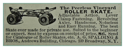 Roller skates had wooden or metal sole-plates, which attached to a skater’s shoes with strap and/or clamps. Varying in cost and quality, they were most often adjustable, which made borrowing a pair easy. Wheels were usually wooden, as was the skating rink floor. The advertisement shown appeared in Youth’s Companion many times in 1885.